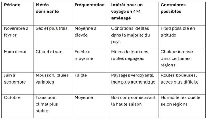 L’Inde est rythmée par trois saisons climatiques majeures, chacune apportant une atmosphère, des opportunités et des défis différents lorsqu’on voyage en 4×4.