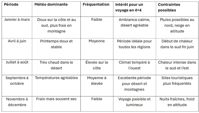 Le printemps et l’automne, entre mars et mai puis de septembre à octobre, représentent les périodes les plus équilibrées. Les températures sont agréables, les pistes généralement accessibles et la fréquentation touristique plus modérée, ce qui en fait des saisons idéales pour découvrir le Maroc en 4×4.